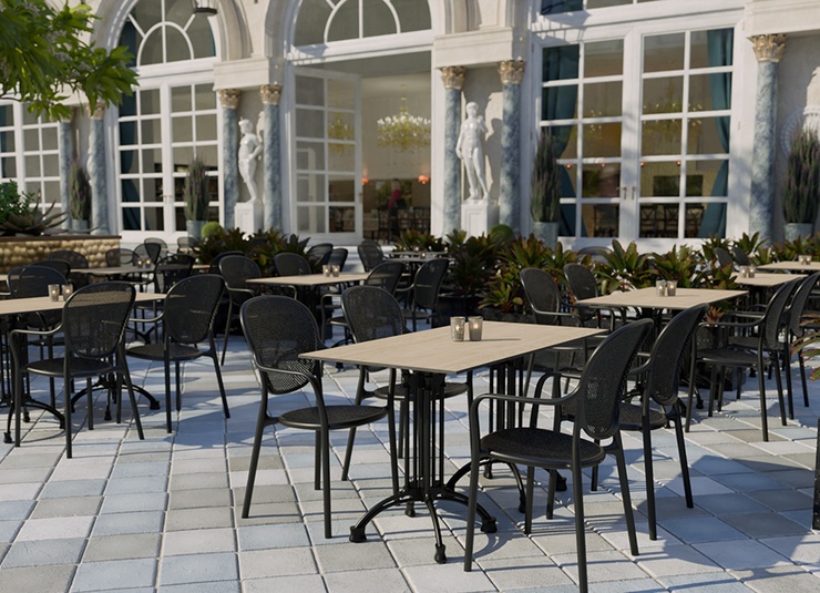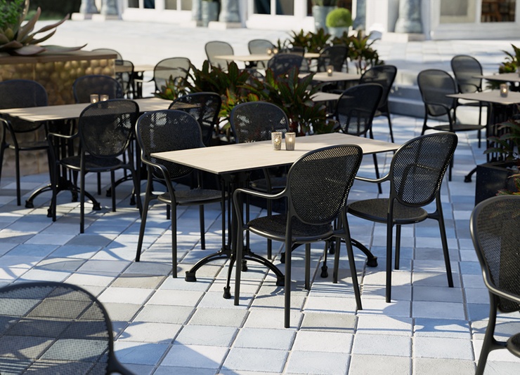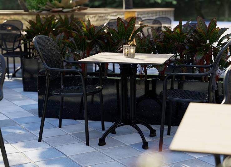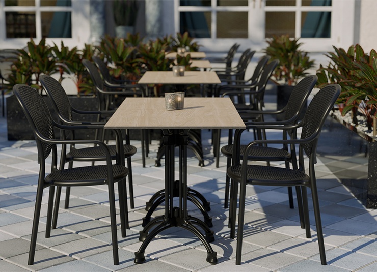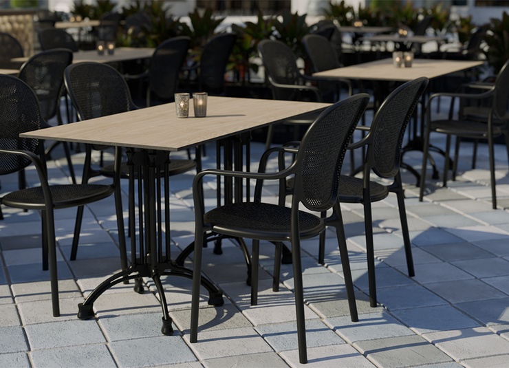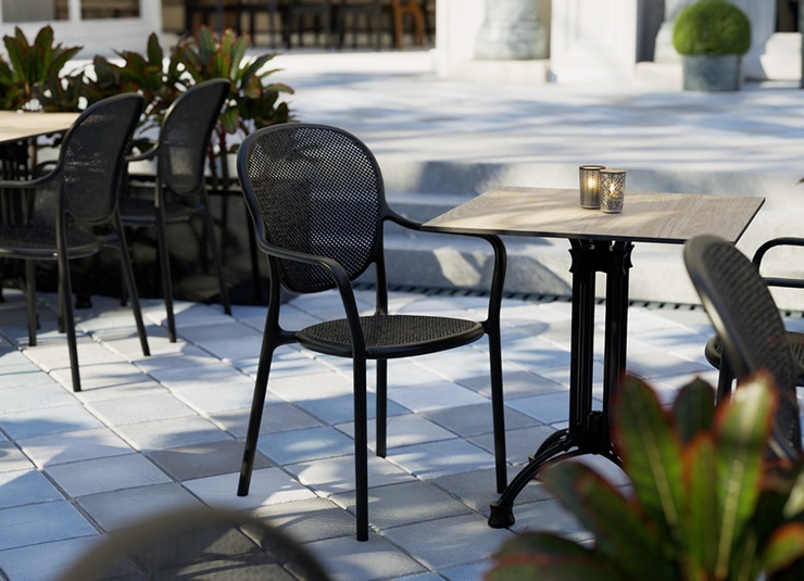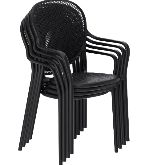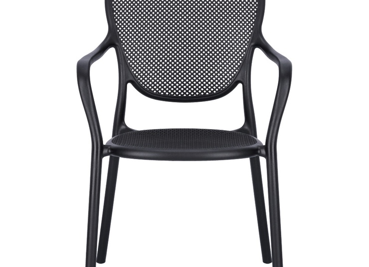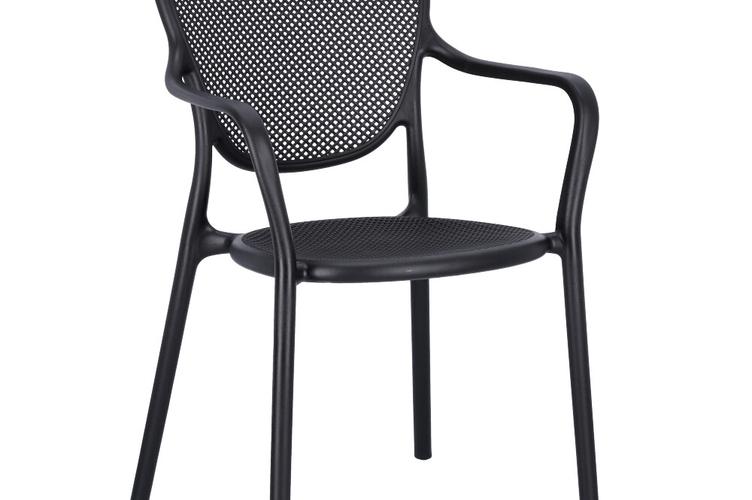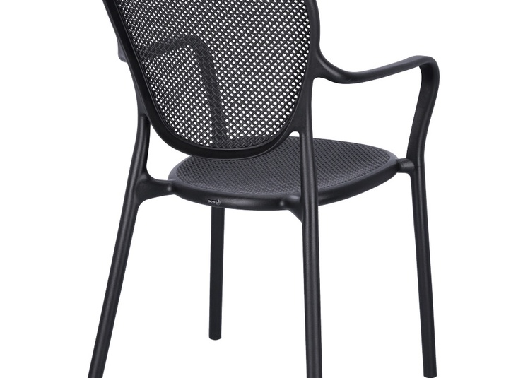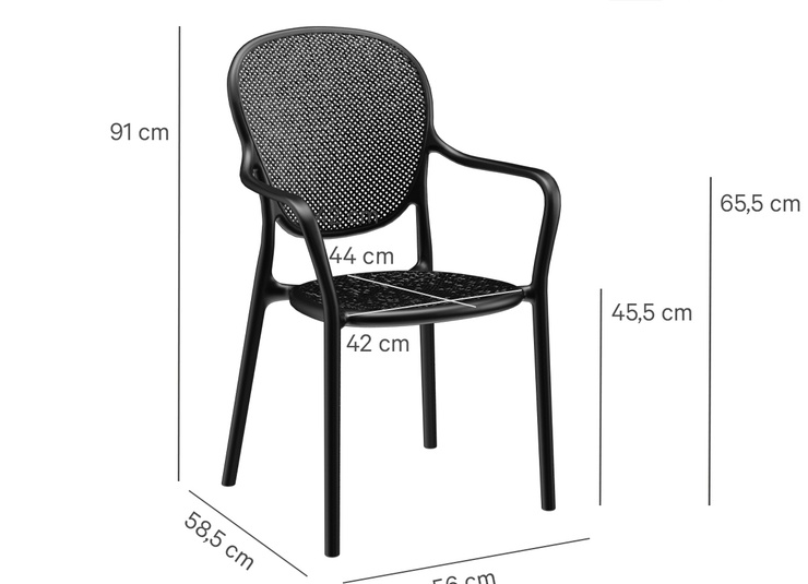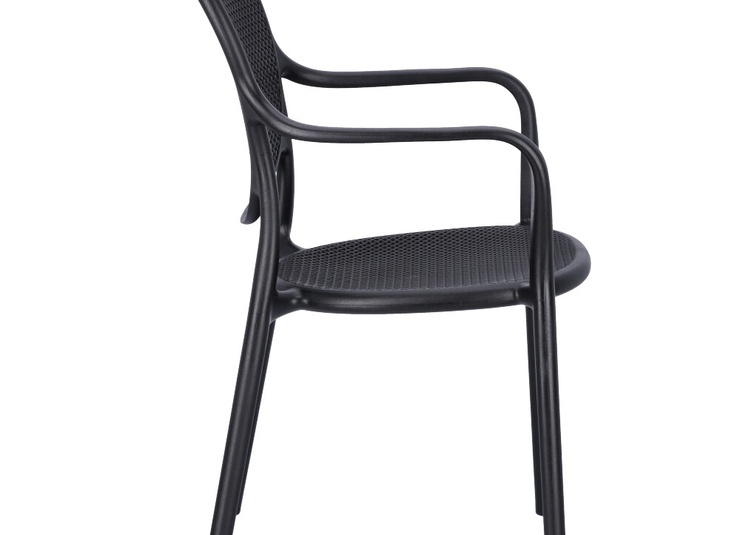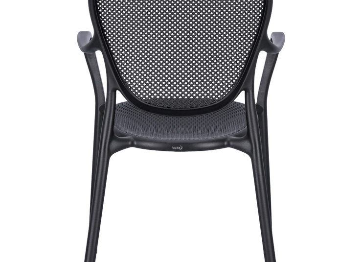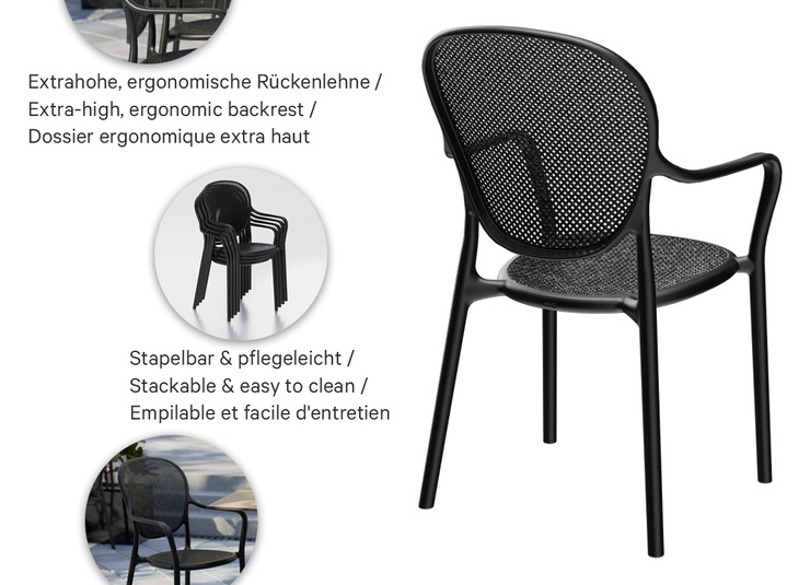 Robust gastronomic armchair Ermon made of glass-fiber reinforced polypropylene – dimensionally stable, UV- and weather-resistant. The high, ergonomically shaped backrest and wide armrests make it particularly comfortable, even during longer sitting periods. Perforated seat and back surfaces ensure ventilation and quick water drainage – ideal for indoor and outdoor use. Stackable for space-saving storage and fast reconfiguration. Easy to clean: smooth, low-joint surfaces can be wiped or rinsed effortlessly.- Extra-high, ergonomic backrest – noticeably more comfort during longer sitting periods.
