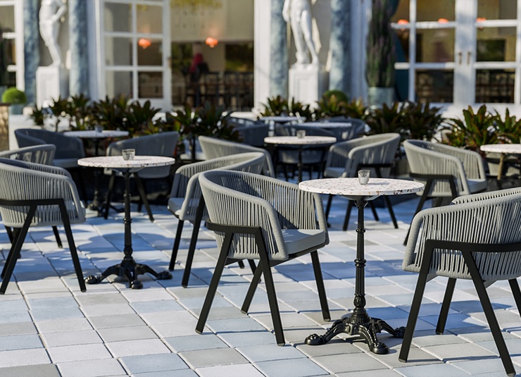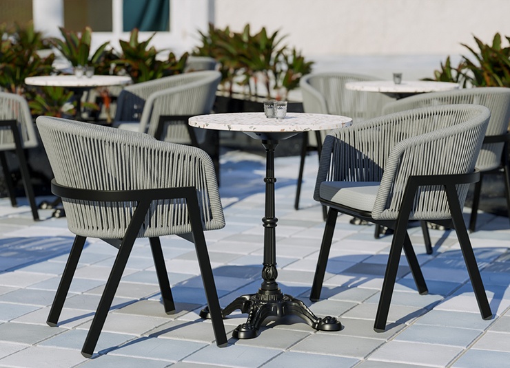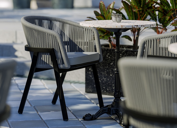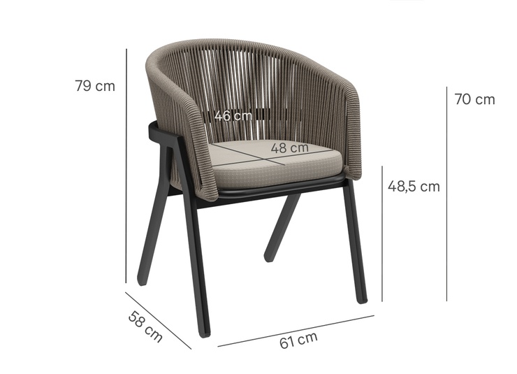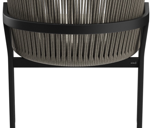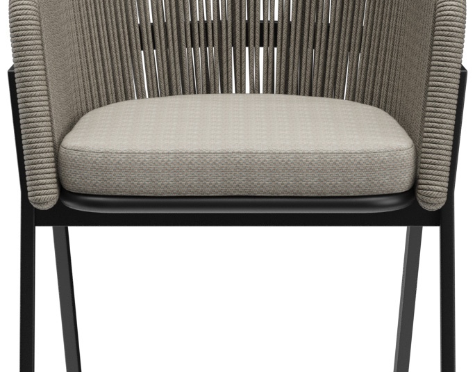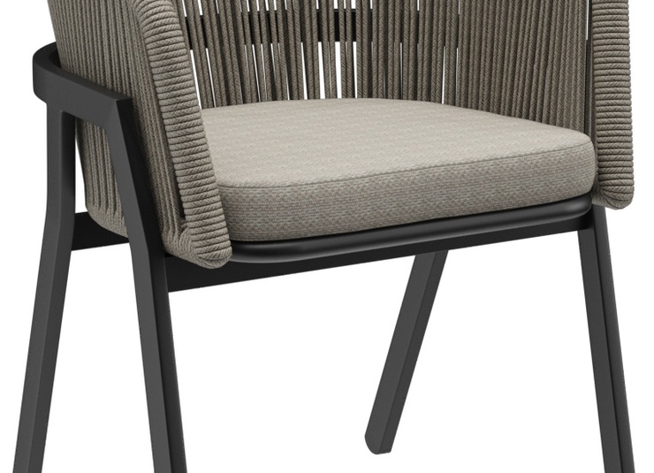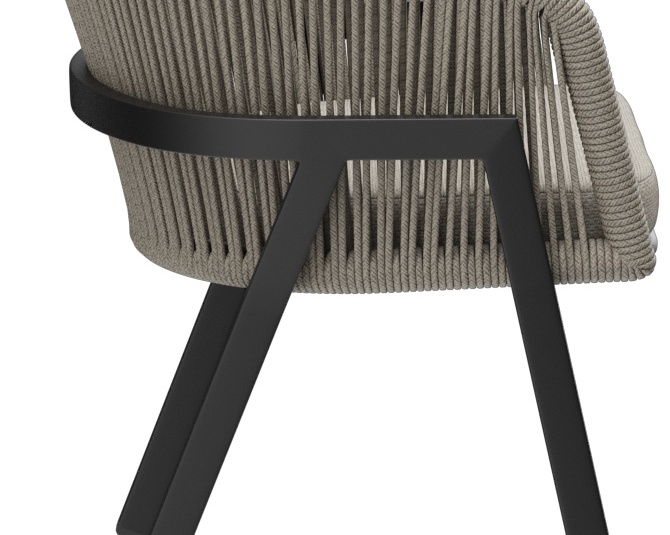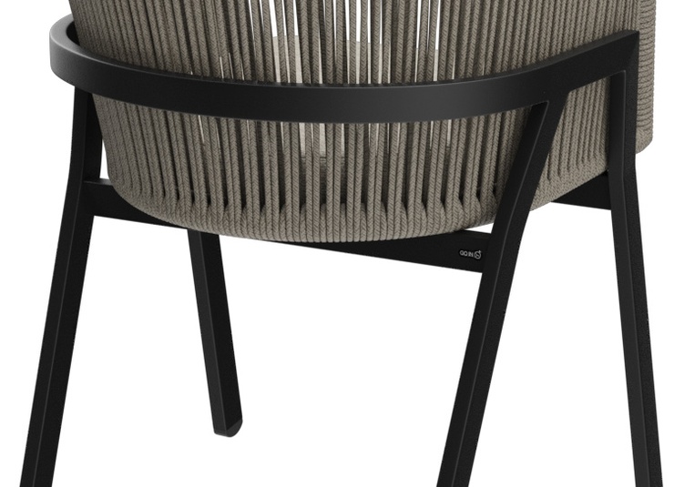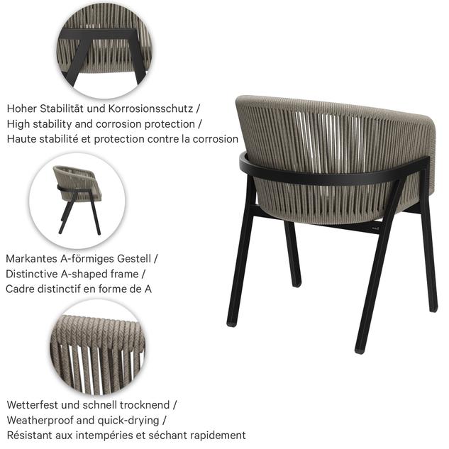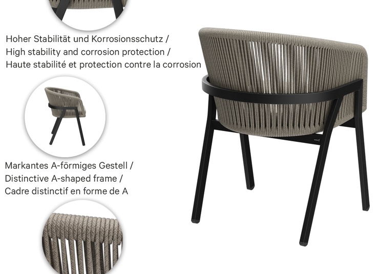 The outdoor chair Maviel is designed for permanent use in outdoor areas and combines a clean look with high everyday practicality. Its distinctive feature is the A-shaped frame: a striking, architectural line design that gives the chair an independent silhouette and visual lightness. The powder-coated aluminum ensures stability, low weight, and long-lasting corrosion protection. The backrest made of weather-resistant synthetic rope picks up the modern form, offers pleasant flexibility, and does not absorb water when it rains. As a result, the chair dries quickly and is ready for immediate use again without extensive maintenance. The design is complemented by a matching Olefin seat cushion that is colorfast, UV-resistant, and easy to care for.
